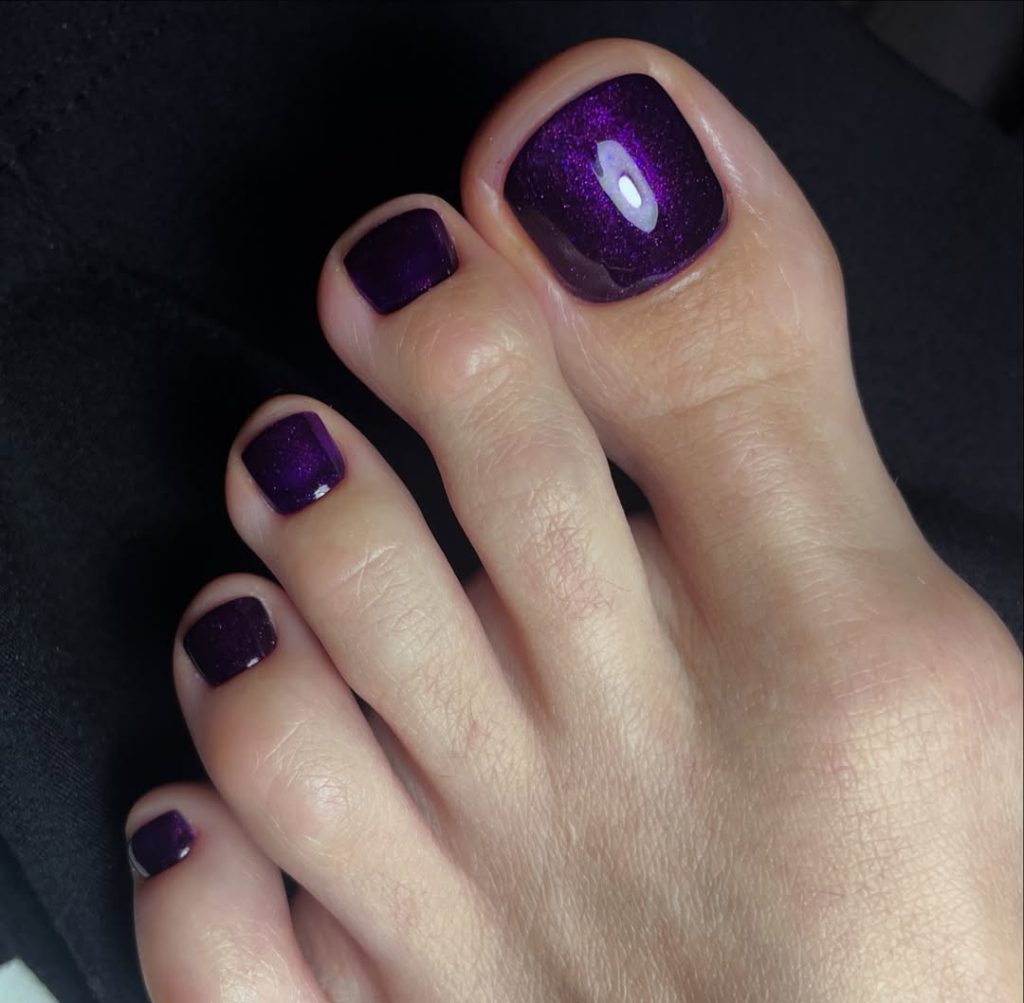 This bold purple pedicure brings a playful energy to spring styling. Saturated and glossy, it stands out without needing additional design elements, letting color do all the work.