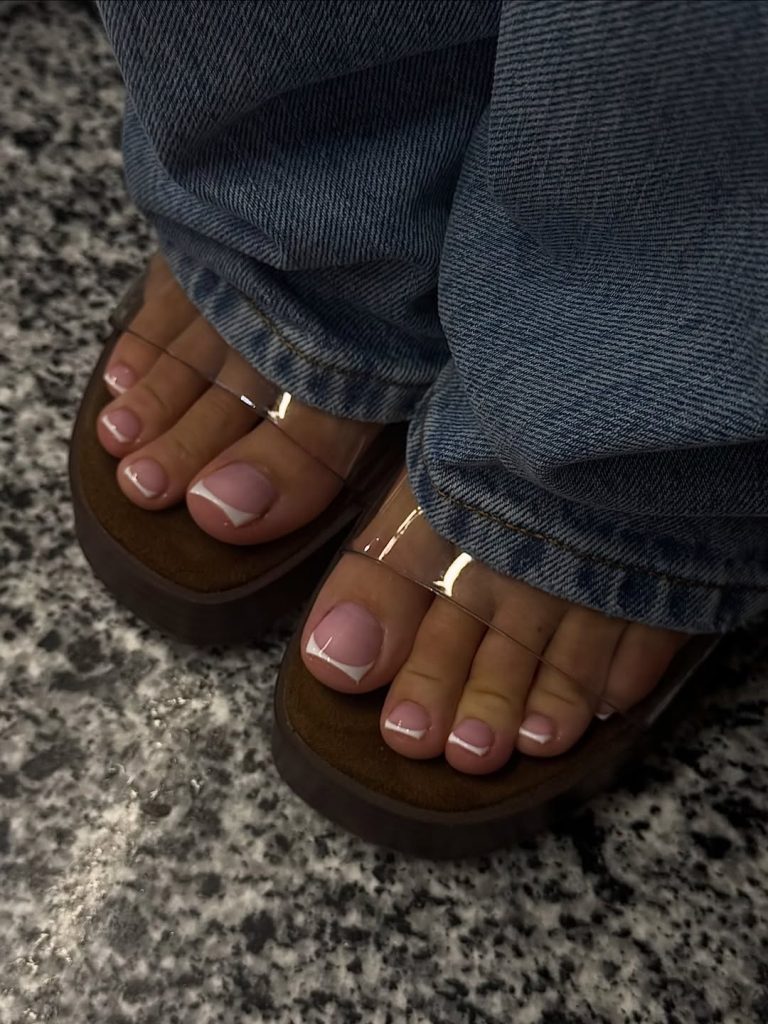 This pared-back French pedicure focuses on precision and balance. A soft pink base paired with slim white tips creates a look that feels effortless and timeless.