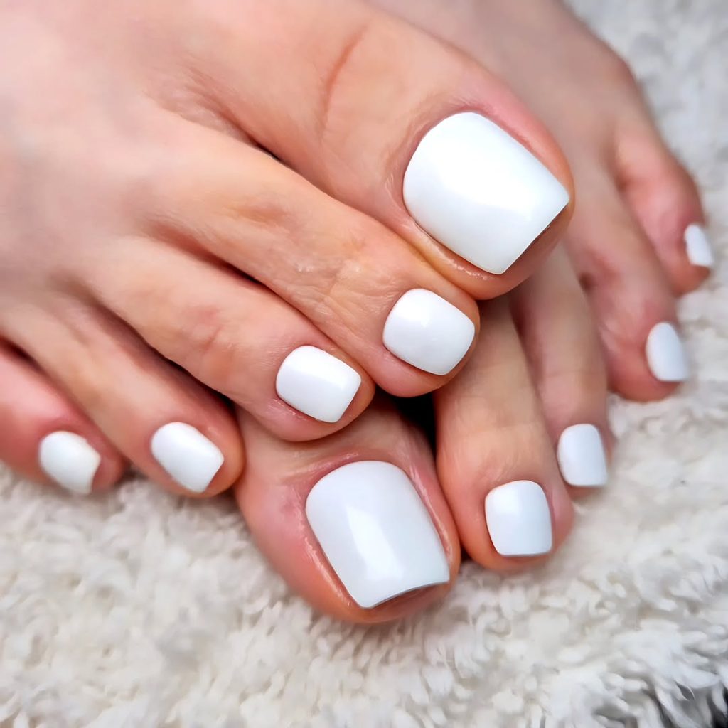 A solid white pedicure closes this section with clarity and confidence. Bright yet neutral, white toes are a spring staple that continues to feel modern in 2026 trends.