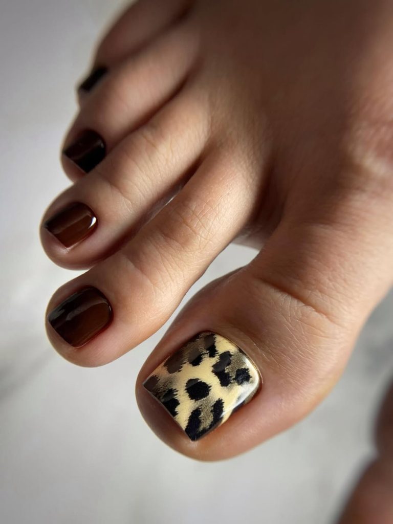 Animal accents are reappearing in Spring toe nails 2026, but in a more restrained, wearable form. Here, a single leopard-print accent nail is paired with glossy chocolate brown toes, creating a look that feels fashion-forward without being overpowering.
