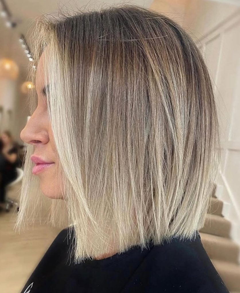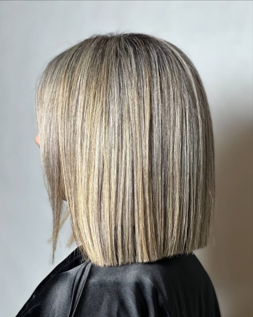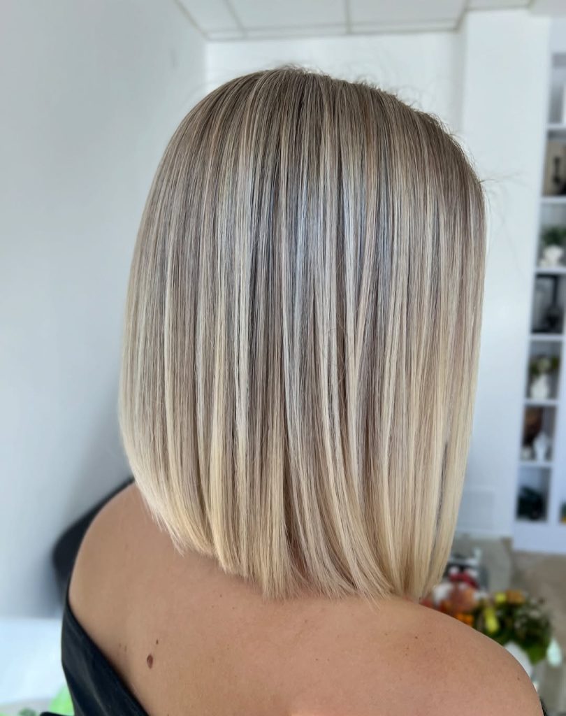 Pure minimalism: a crisp, even perimeter that hits just above the shoulders and reads ultra-straight. The cool-neutral blonde ribbons amplify shine and make strands look fuller—especially helpful for fine hair. Ask your stylist to blunt-cut dry, then micro-dust the hem so it stays razor clean. Home routine: heat protectant, paddle-brush blowout, one low-heat iron pass, and a pea-sized gloss only on the mid-lengths. The result is a boardroom-to-brunch medium bob that never feels overdone.