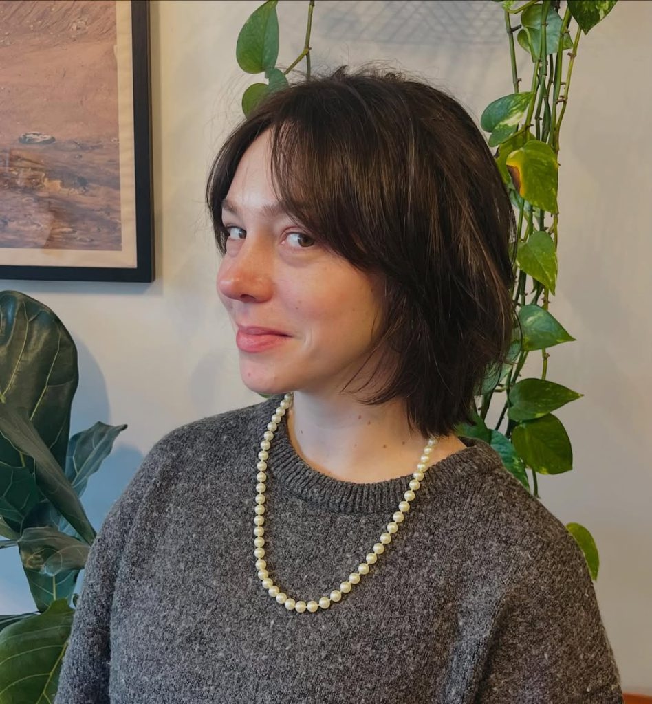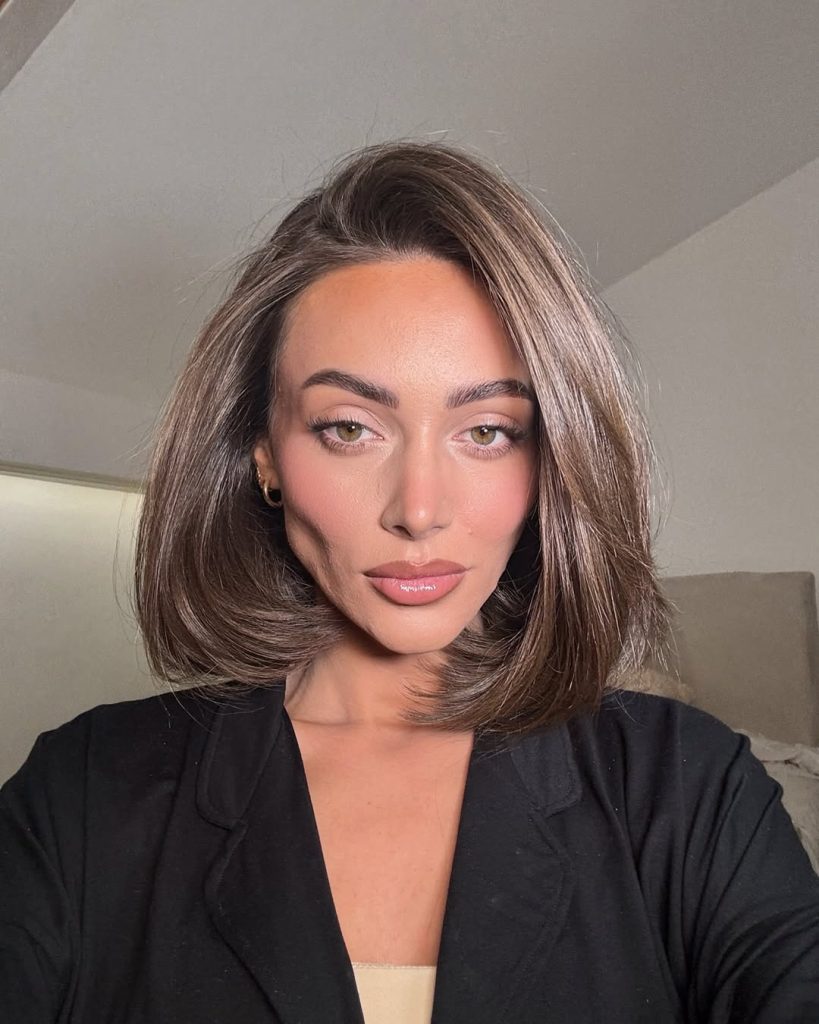 A chin-length bob with feathered curtain bangs that float off the face. The smoky brown tone and satin finish keep it sophisticated, while the light bevel prevents bulk at the ends. It nods to the 90s—think effortless, model-off-duty energy—without feeling retro.