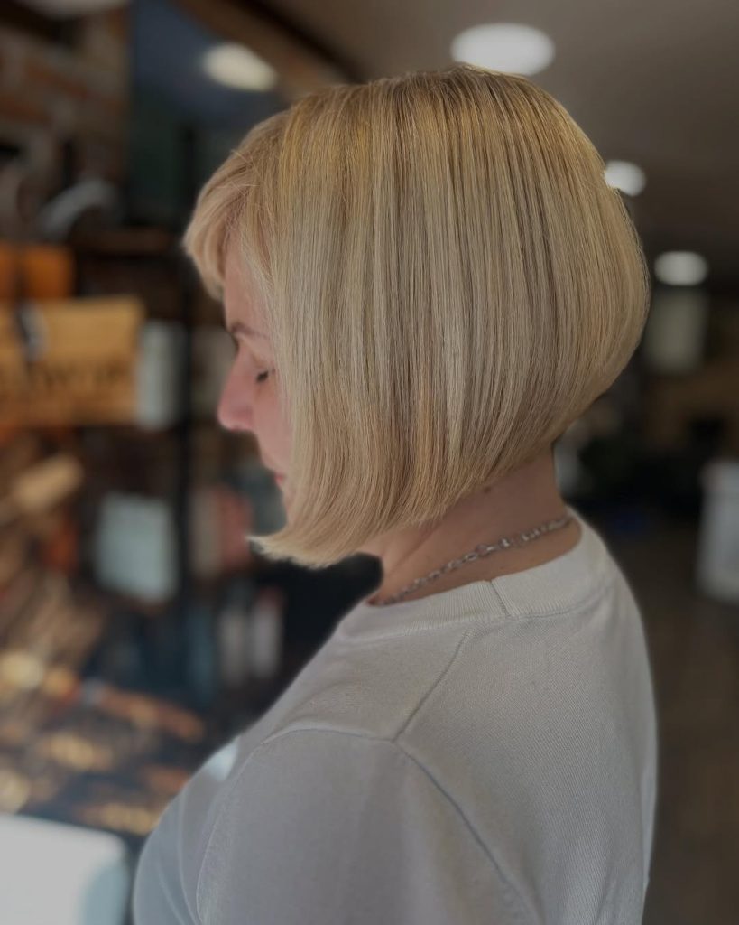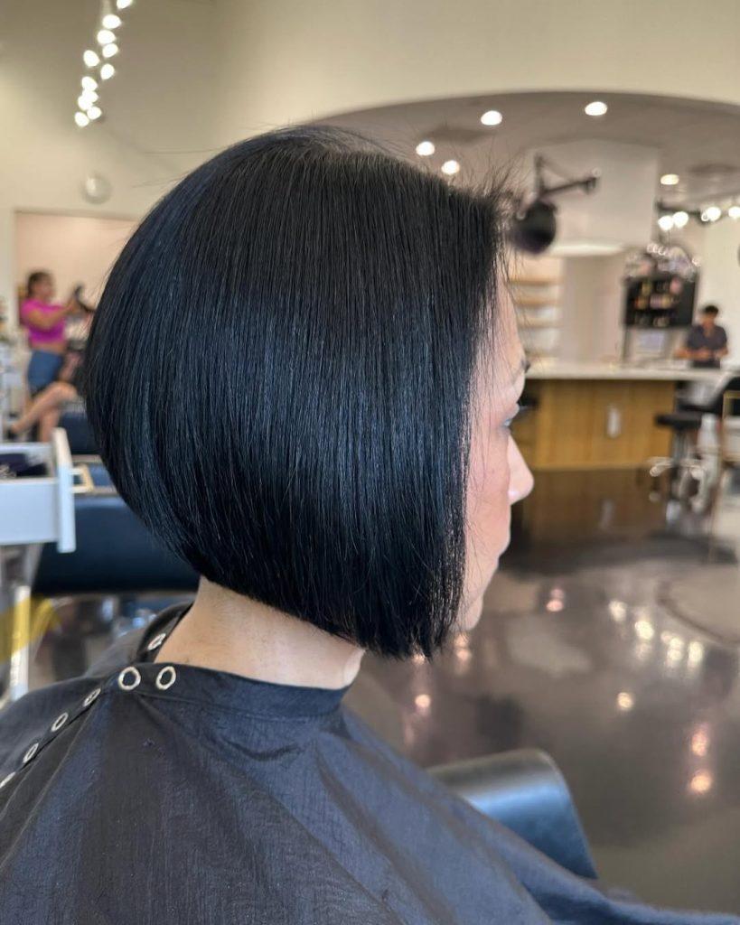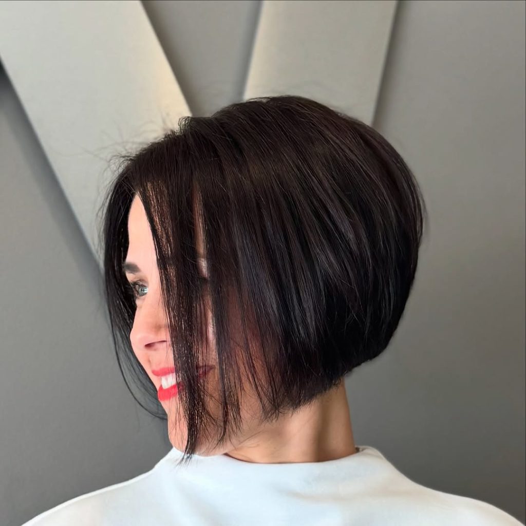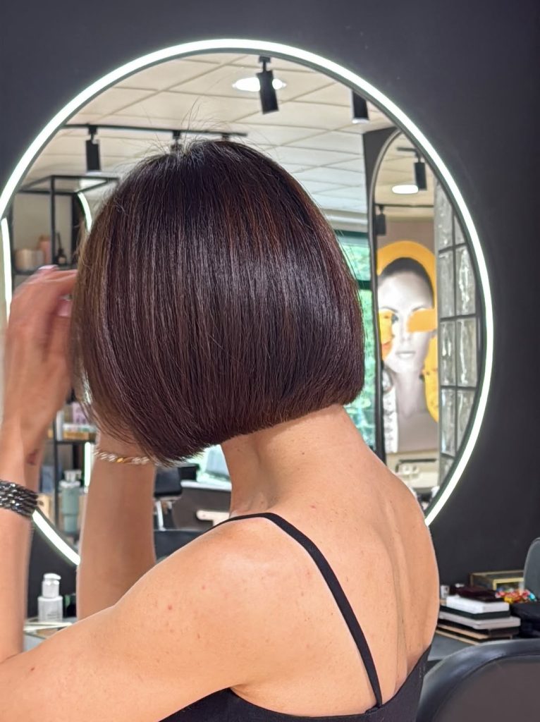 Sculptural from the profile: shorter at the back, gliding longer toward the chin. A discreetly stacked and graduated nape gives lift, while the angled front slices the cheek line—an elegant trick for round face shapes. Keep products light; a heat protectant and one iron pass are all that’s needed to achieve lacquer shine.