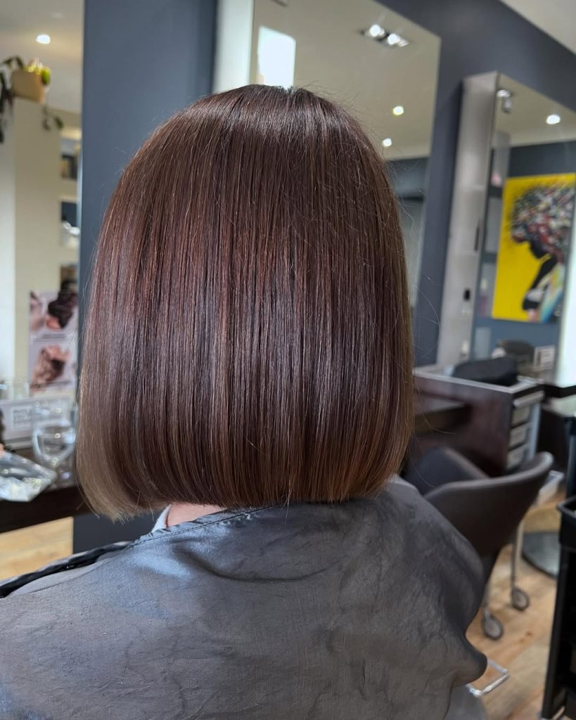 A boardroom-ready classic with soft power. The perimeter is blunt, then beveled under for a capsule-wardrobe kind of hair: minimal, immaculate, and timeless. The neutral brown reflects beautifully under indoor lighting, and the length kisses the collarbone—long enough to tuck, short enough to feel 90s sleek. Blow-dry downward with a flat brush, then pass a low-heat iron once to seal the cuticle.