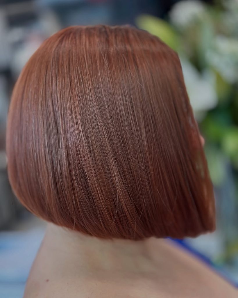 Softly tucked under with a round brush, this coppery bob shows how a beveled baseline can frame the neck without bulk. The silhouette reads classic yet modern—think quiet luxury hair. Keep the interior clean (no heavy debulking) so the curve stays plush. Gloss every 6–8 weeks to protect that molten tone from fading.