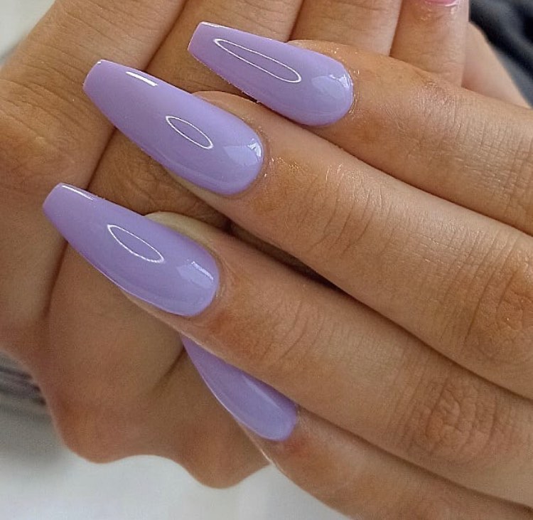 This high-gloss set leans sleek with a tapered ballerina silhouette that reads like a soft almond from some angles and a slender coffin from others. The color is a pure pastel purple—smooth, mirror-bright, and unapologetically long. It’s the kind of manicure that lifts a simple ribbed tank and trousers instantly.