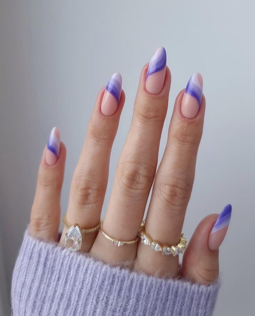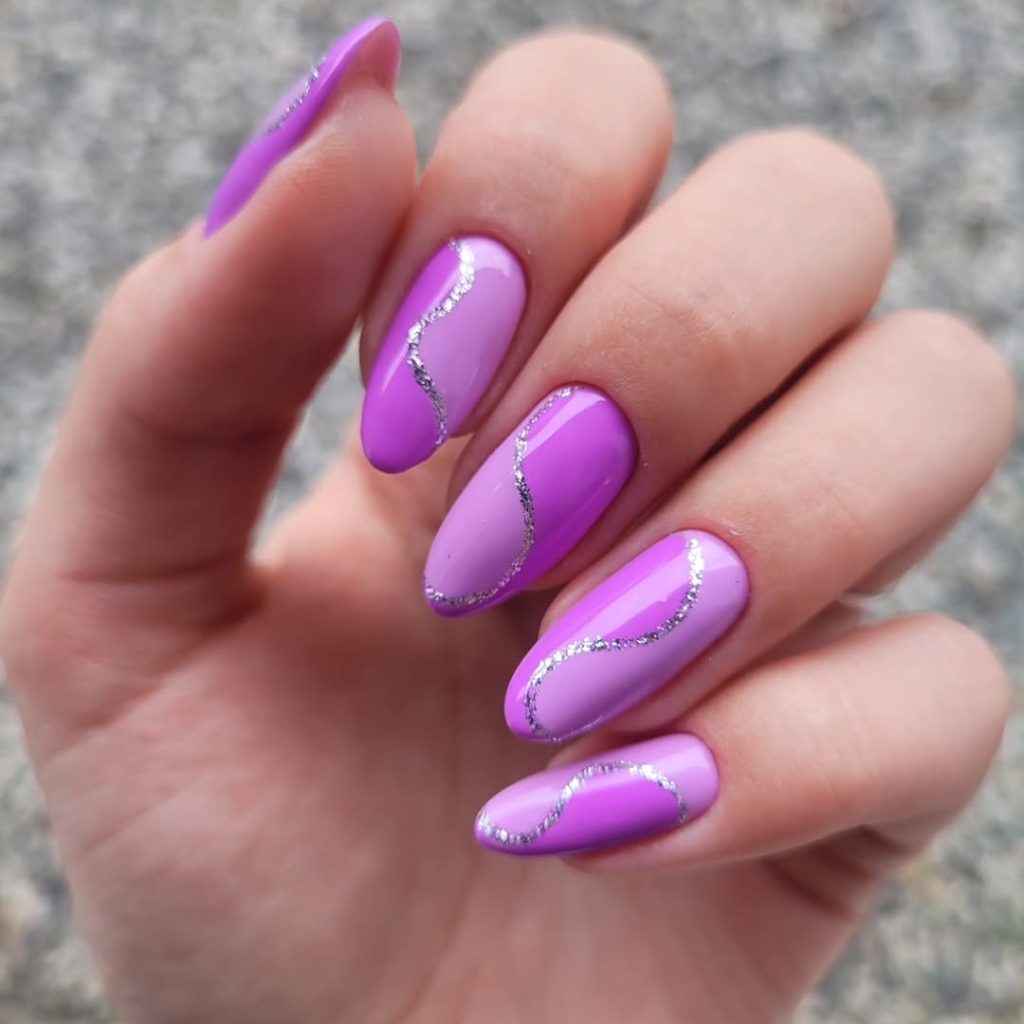 Curvy waves in two lilac tones skim across an almond-shaped tip base, noted by a sparkly silver accent line. It’s graphic nail art that’s also wearable, akin to a silk scarf.