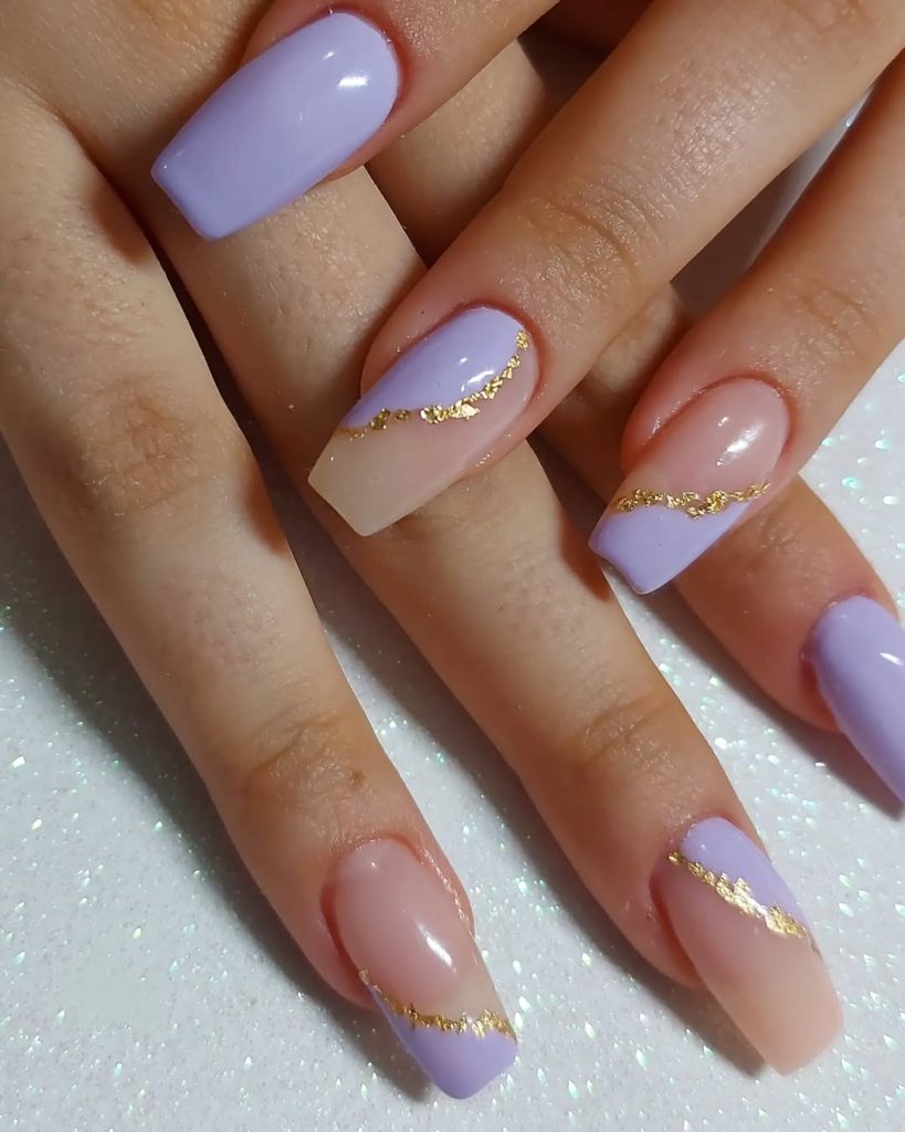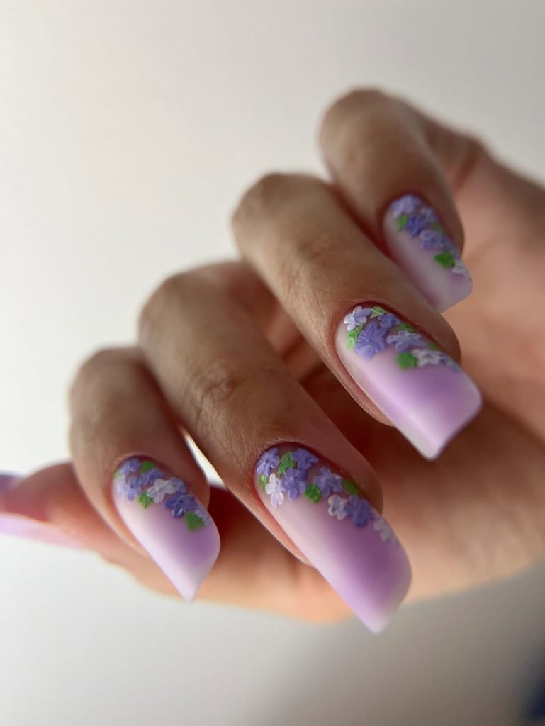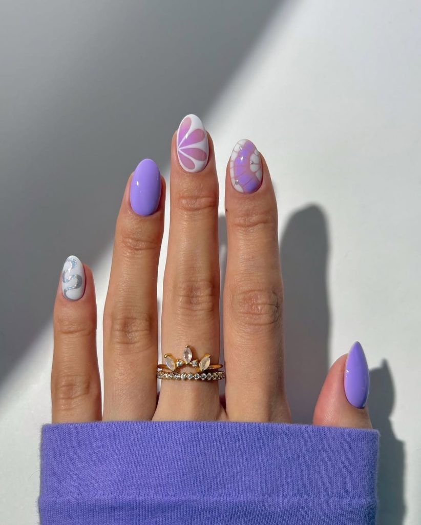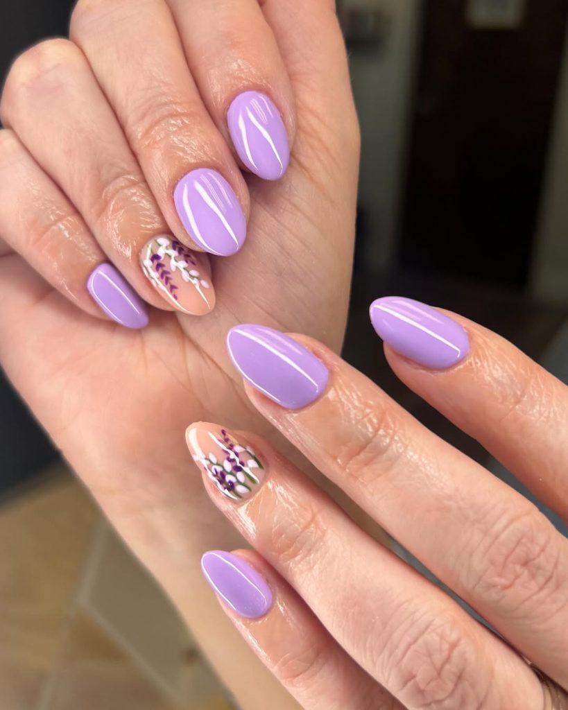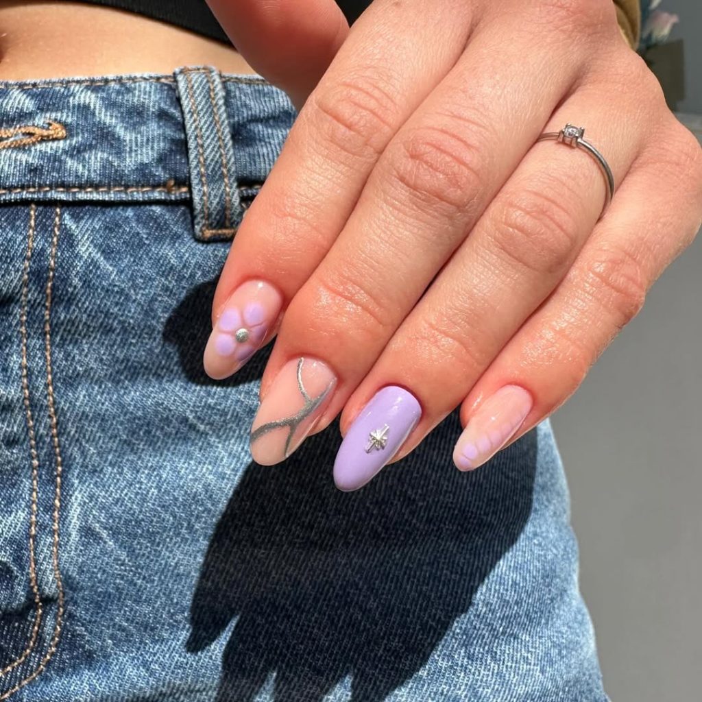 If you prefer short nails, this design brings joy without bulk: a sheer base with hand-painted lilac flowers, micro-foil centers, and one fully painted nail for balance. It’s the definition of pastel purple, short, and wildly cute for picnics, office Fridays, and weekend brunch. Pair with a chambray shirt and delicate rings; match your pedi on toes to a pale lilac for a pulled-together summer look.