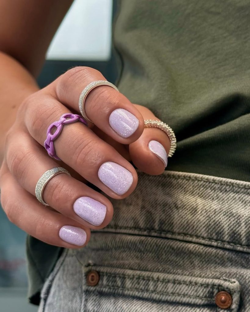 Sheer-to-opaque Pastel short purple nails dusted with fine shimmer catch the light without screaming “party.” The rounded shape keeps it youthful yet practical.