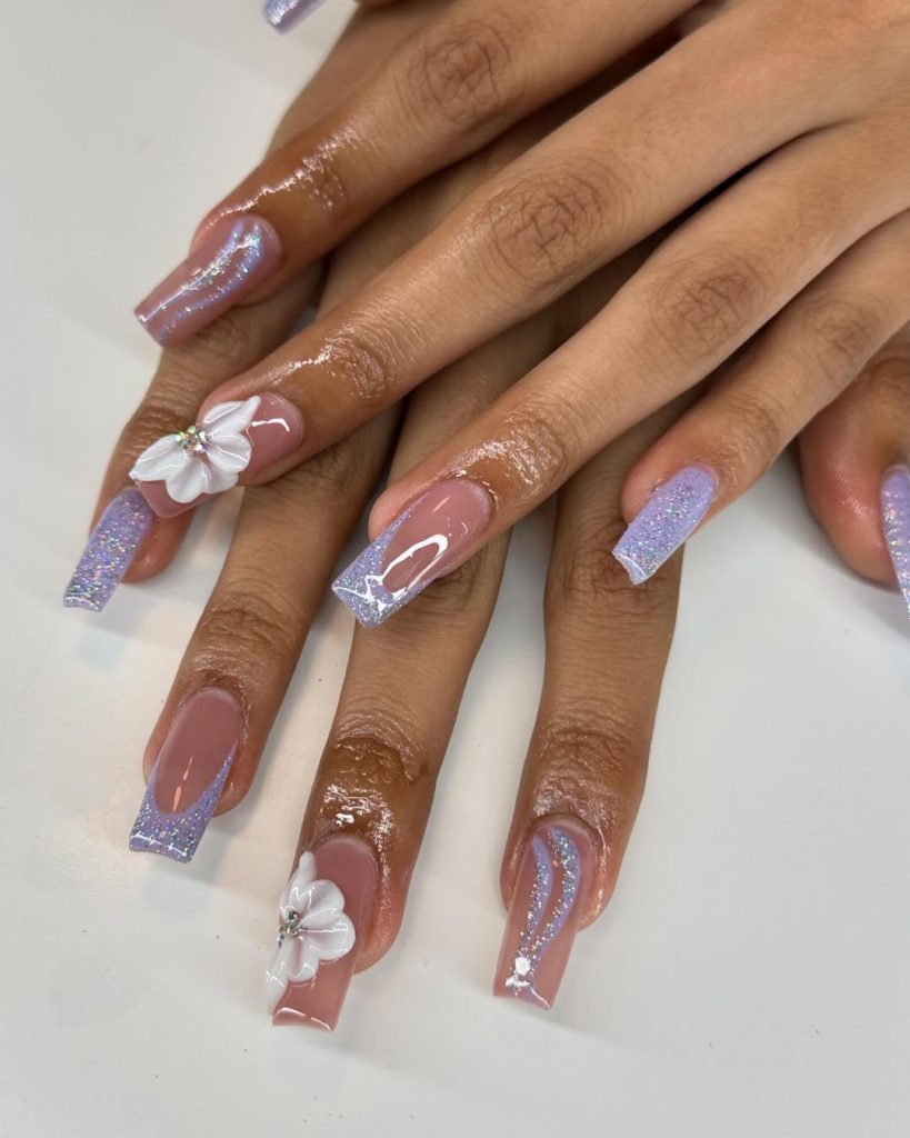 Glass-shine Square tip designs get a party started with lilac microglitter, French lines, shimmered waves, and sculpted 3D flowers topped with crystals. A nude tip background will keep everything elegant, with a couture boost of sculpted flowers that are just right for a quince dress code or proms, quince, or just a dress code-friendly summer celebration in summer 2026. This look is best paired with a satin slip and white and silver jewelry; let the nails be the statement. Ask your artist for a neutral builder base and a cool lilac glitter gel to keep the lines crisp and long-wearing.