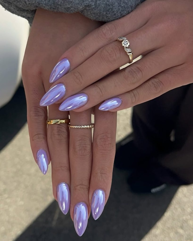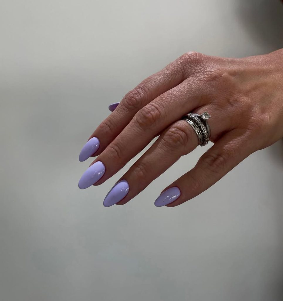 A glossy lilac set on tapered almond nails shows slight tonal shifts from finger to finger—think purple and pastel working together. It’s understated but impactful, the kind of manicure that elevates linen suiting or a silk camisole layered under a blazer.