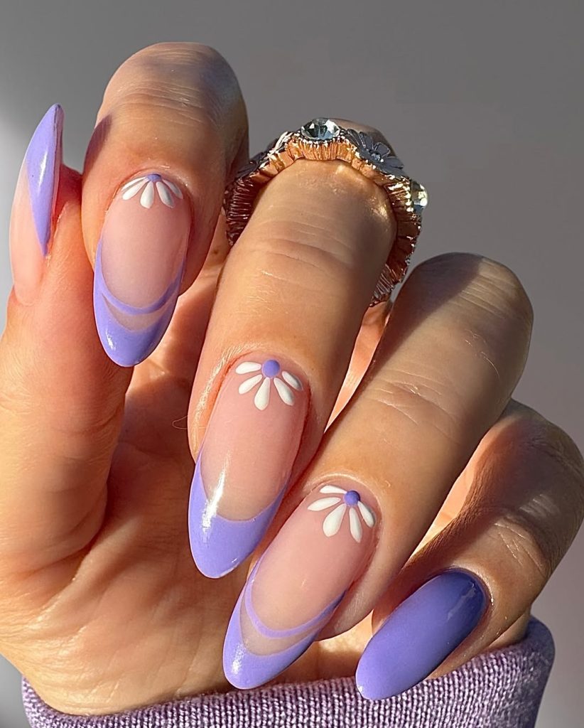 A flirty spin on classics: layered outline French curves in lilac on sheer bases, dotted daisy accents in white and lavender, plus one fully colored nail for balance. The tapered Almond silhouette keeps everything elegant, making this a perfect pastel purple French idea for showers, garden parties, and daytime weddings. Coordinate with a pink and lilac floral dress or a crisp white set; add pearl studs to echo the daisy centers.