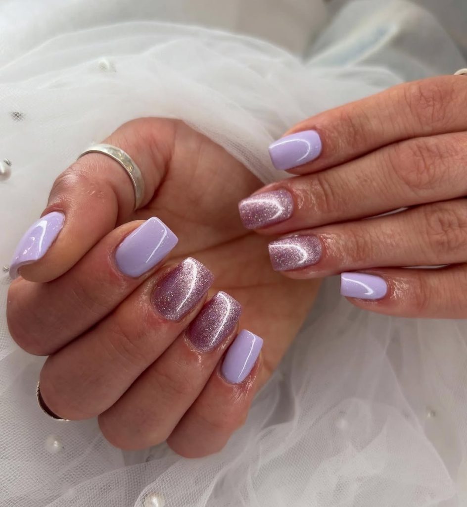 Shimmer meets solid: icy lilac on crisp square nails, plus two glitter gradients that catch light like jewelry. This set is celebration-ready—think prom, anniversary dinners, or rooftop cocktails all summer. If you love tonal sparkle but not full-on glitter, alternate just one accent per hand. A cool-toned highlighter on cheekbones mirrors the effect.