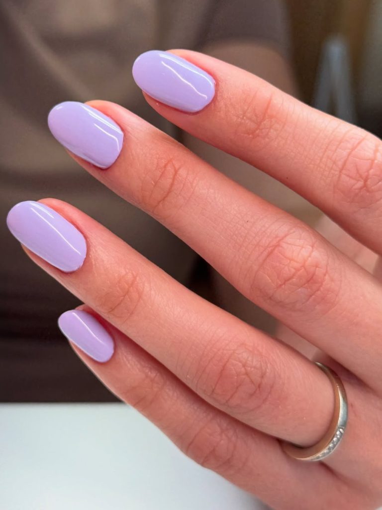 Shorter oval tips in a richer violet-leaning lilac are the definition of polished. The payoff is smooth and vibrant but still daytime appropriate.