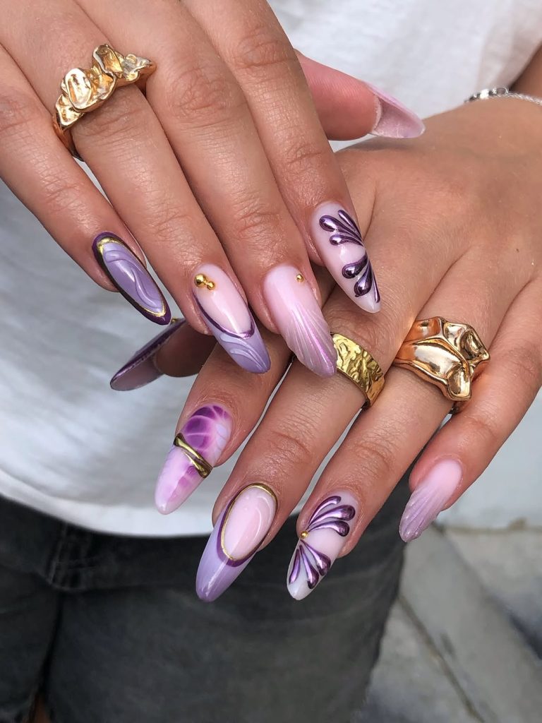 If you love statement art, this is the “save it to camera roll” set: elongated almond tips with swirled purple and rose tones, 3D droplets, and wafer-thin gold outlines. It’s the kind of manicure that photographs beautifully at events—think gala season, milestone dinners, even modern prom looks for moms or mentors. Keep your outfit sleek—black slip, structured blazer—so the nails play lead.