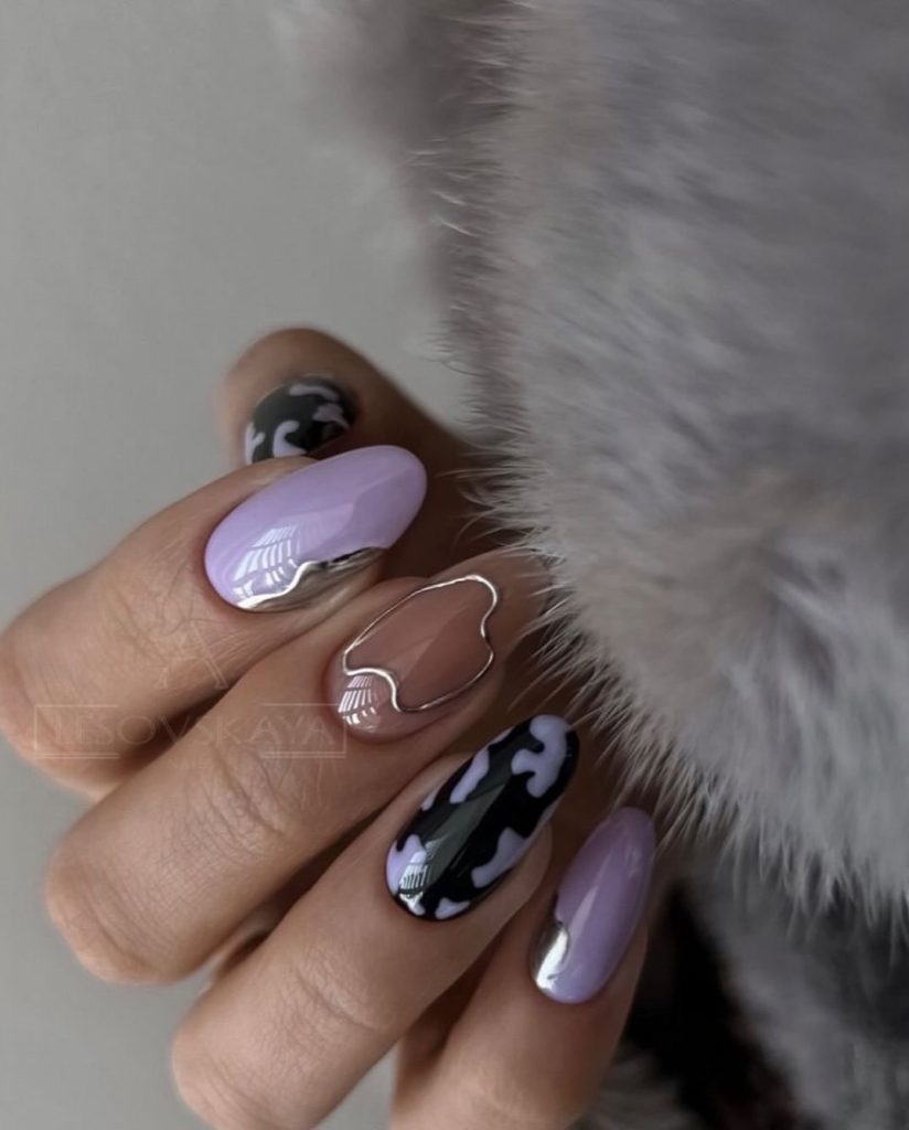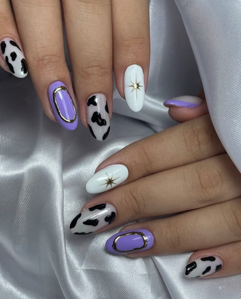 Monochrome spots in black and white and framed lilac “cameo” nails outlined in gold—bold yet surprisingly wearable. The almond-oval length keeps it chic, especially with a crisp white shirt and straight-leg denim. For a softer read, do the cow print on just one finger per hand and keep the rest lilac.
