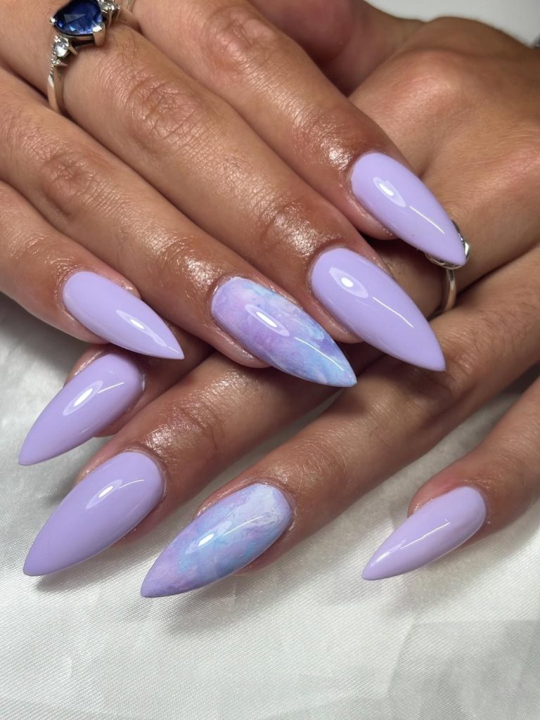 Tapered, stiletto-leaning almond nails dressed in glossy lilac, spotlighting two ethereal marble nails swirling blue and purple and opalescent highlights. The silhouette feels fashion-editor chic and undeniably long, perfect for a satin slip and strappy heels. Ask your tech to layer a sheer lilac jelly over a pale blue marble to keep the colors dreamy—not busy. This is a photogenic pick for events throughout 2026.