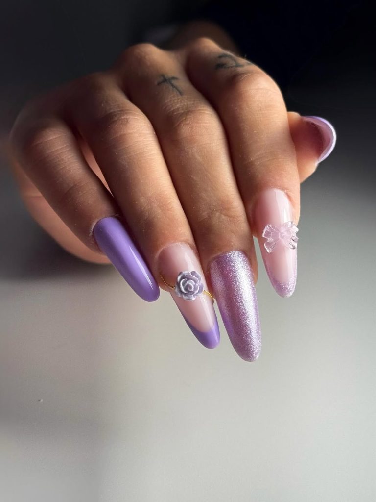 A curated set that blends finishes: solid lilac, a micro-sparkle accent, and blush-nude nails with slim lilac French tips topped by tiny 3D flowers. The elongated almond shape flatters every hand, and the palette skews pink and lilac, feminine without fuss. Try it for prom nights you’re attending as a guest, bridal showers, or milestone birthdays.