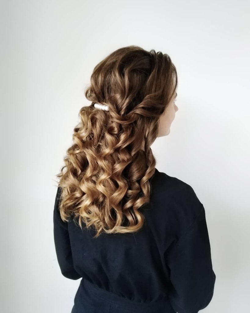 This half-up is the unicorn of medium hair: it keeps ringlets defined while opening the face. Two soft twists meet at the back with a small pearl clip, leaving glossy coils down. The shape reads “cute and dressy” without trying too hard.