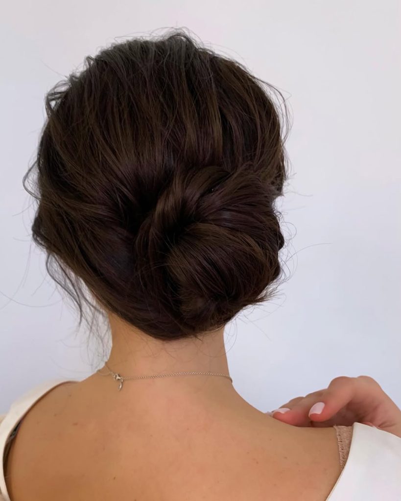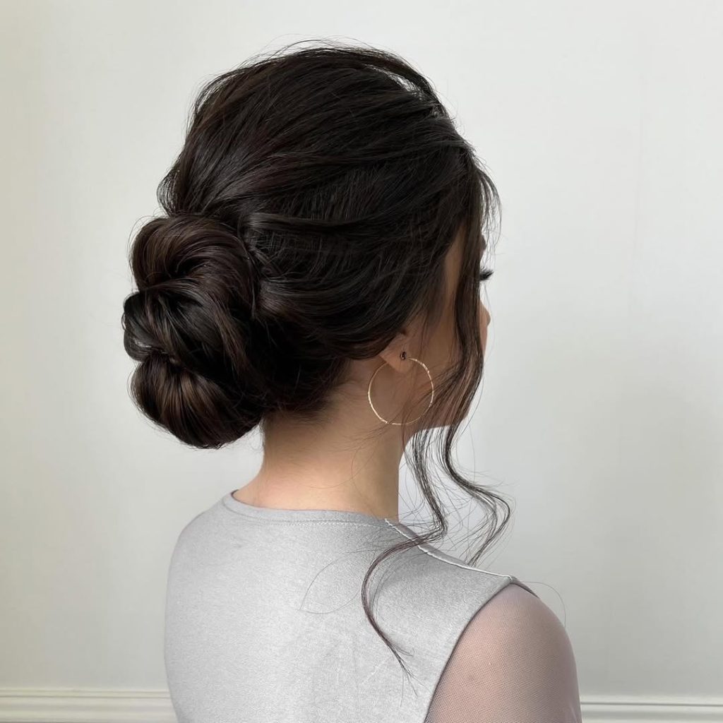 A softly gathered updo with airy pieces—chic without stiffness. The bun sits at the nape with feathery texture and a subtle twist, ideal for anyone who wants “undone” that still photographs beautifully.
