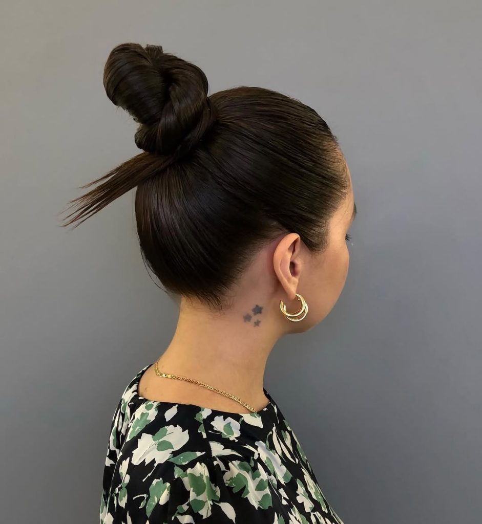 Two coils merge into one polished knot—like a ballet bun’s artistic cousin. A single tendril and wispy texture keep it feminine rather than severe. The proportions flatter medium hair because the bun doesn’t overwhelm the neck.