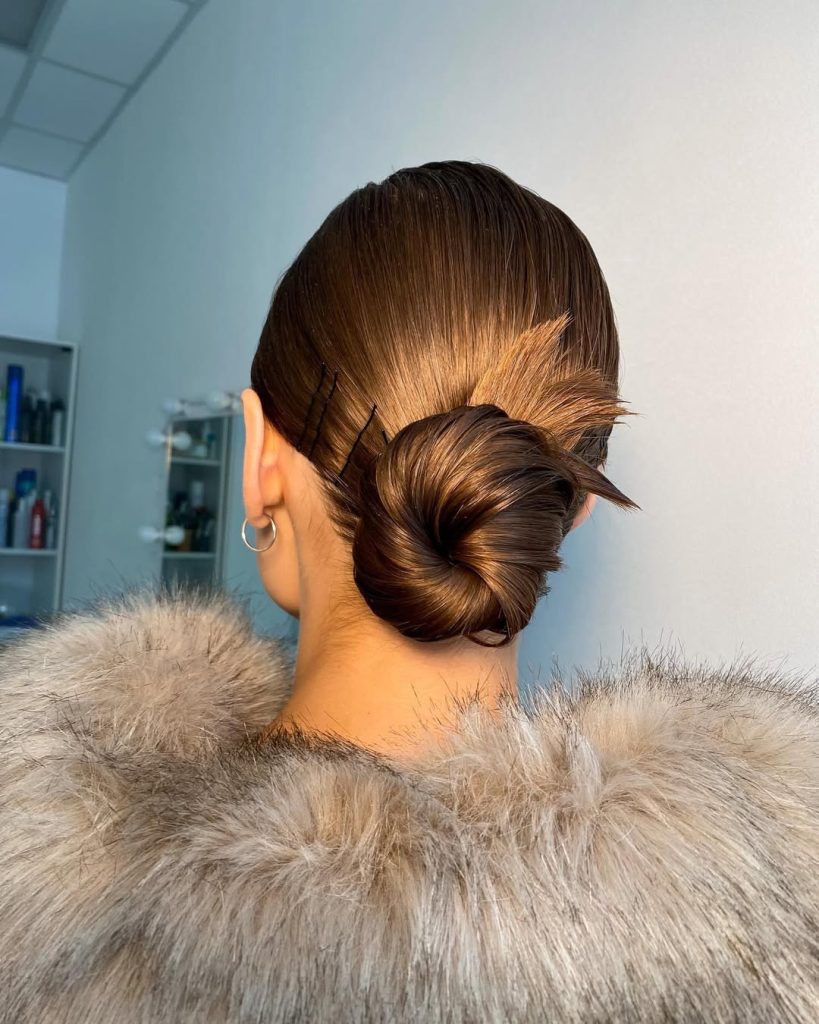 This is the red-carpet cousin of the low bun: a glossy, tucked coil with a purposeful flare of ends and neat pin placement along the side. It feels couture but remains wearable for real life.