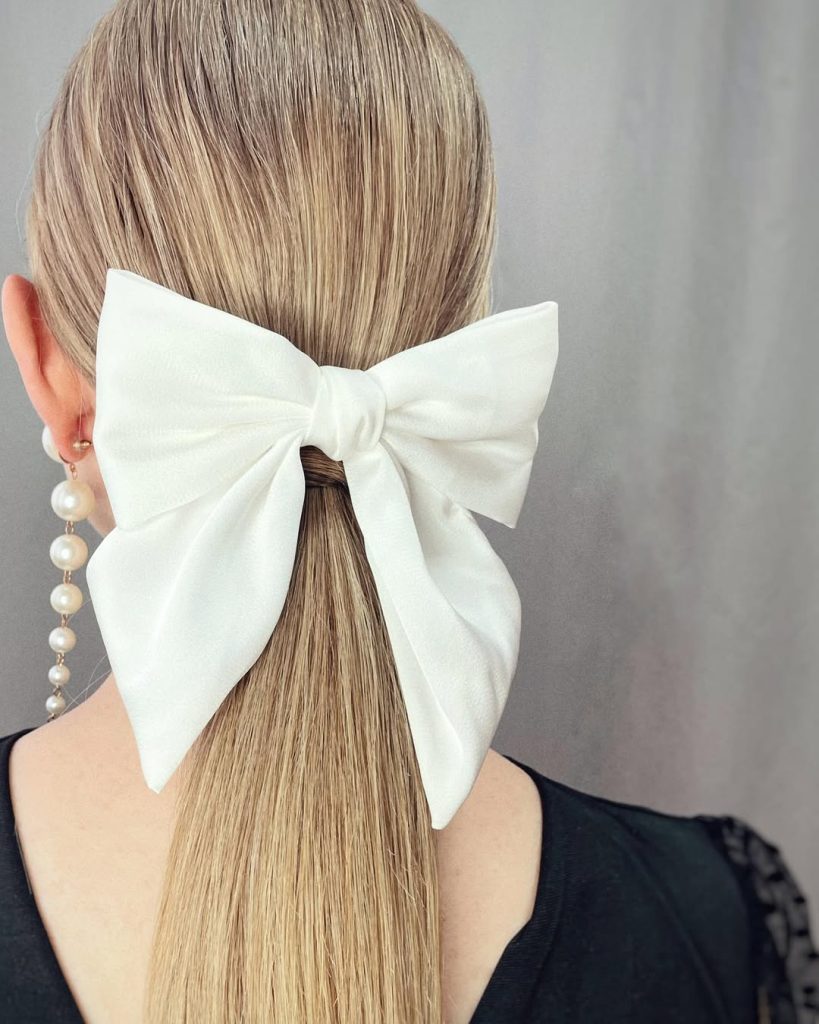 What you need in 2026 is a polished low ponytail with an oversized white bow. Ironed straight from the crown to the ends. Hair is gathered at the nape so the ribbon sits like a statement accessory. Not a schoolgirl afterthought. The bow’s matte finish adds an editorial feel, while the long ponytail reads neat, minimal, and unmistakably cute.