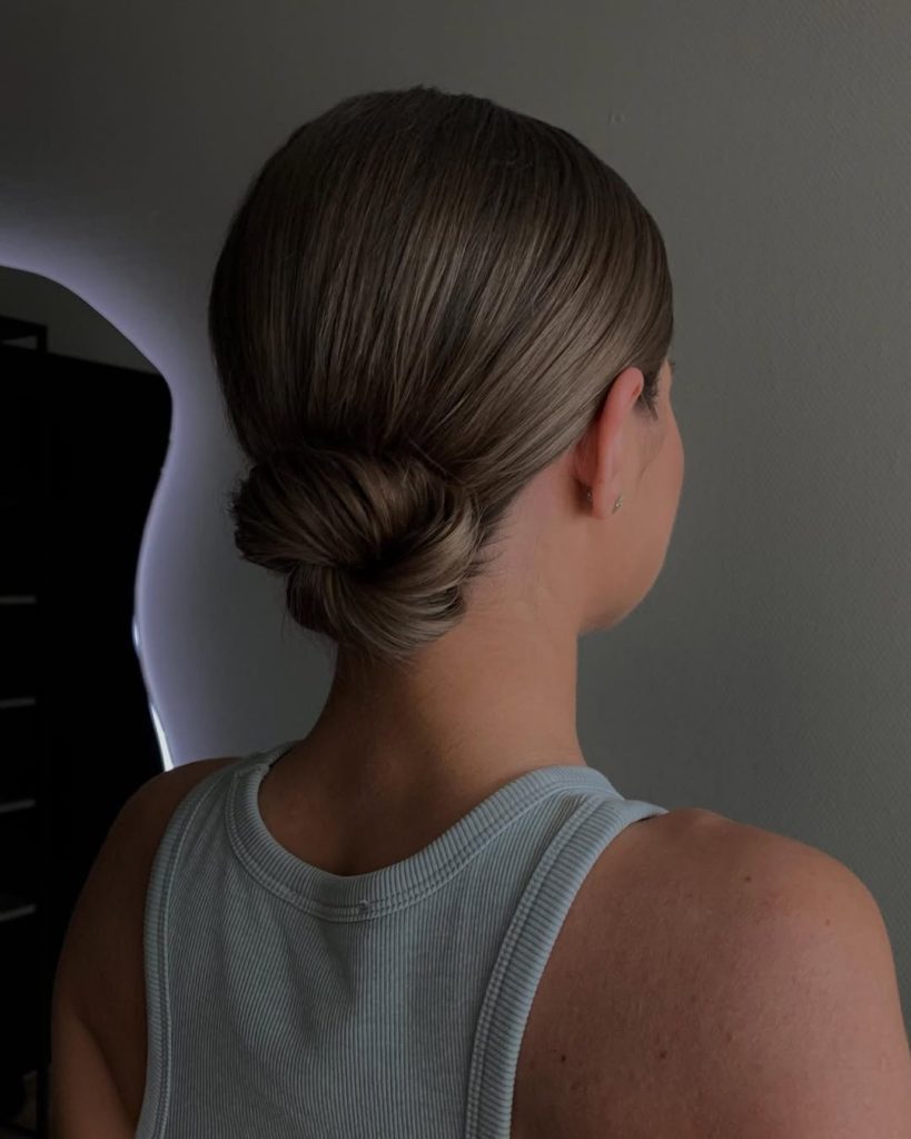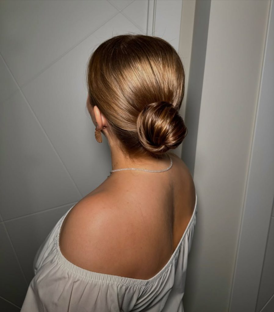 A centered, polished coil at the nape—quiet luxury in hair form. No visible pins, no flyaways, just impeccable lines.