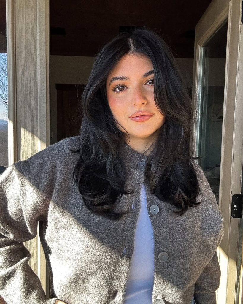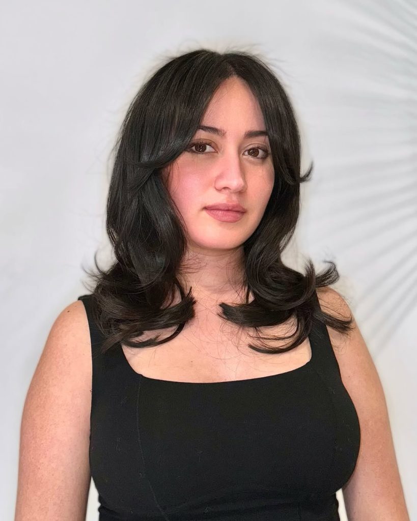 Feathered layers cascade through the mid-lengths and flip at the collarbone; airy bangs part in the center for that effortless “butterfly” movement. It’s the quintessential medium cut for multitaskers.