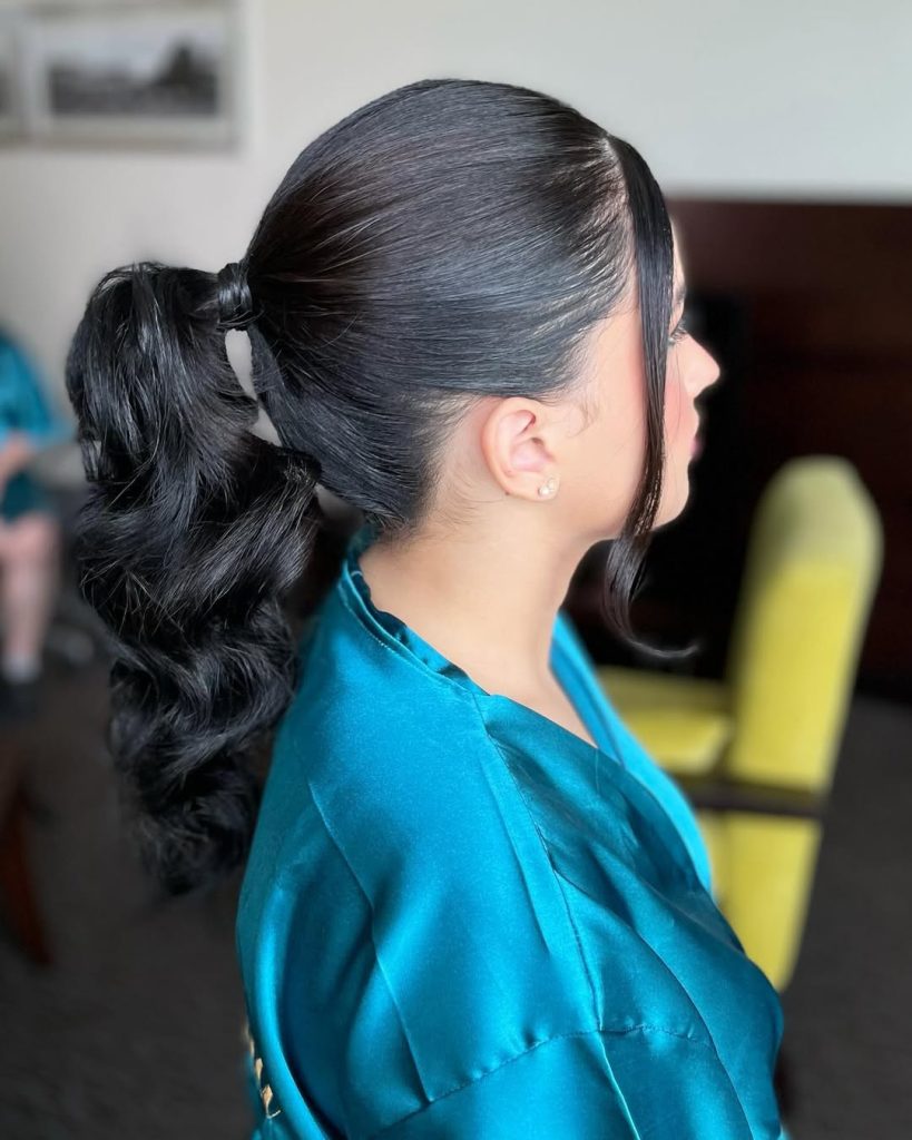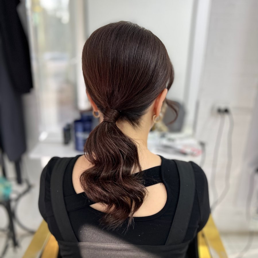 A low ponytail wrapped with its own strand creates a seamless base, then melts into a soft S-wave for movement. The crown is smooth and close to the head, which keeps the look sleek while the ends stay playful.
