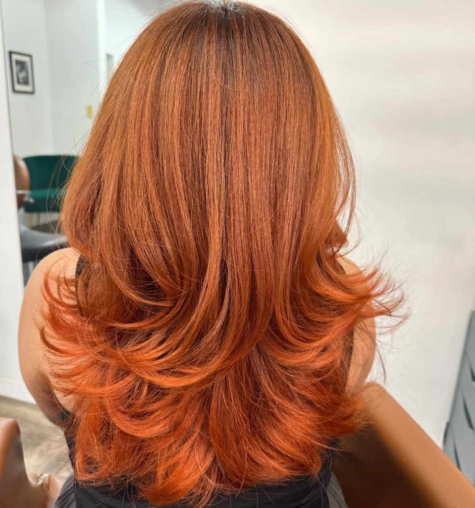 A medium-length copper cut with airy, face-framing layers and feathered ends. The finish is glossy and swingy; the color does the talking while the shape flatters every neckline.