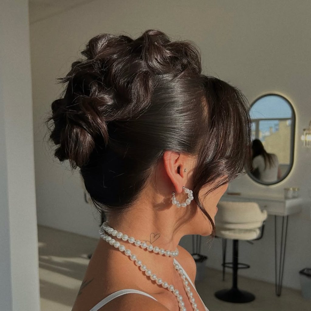 How to style: Curl large sections, backcomb the crown, gather into a secure base, and pin pieces to build height. Mist shine spray for gloss.