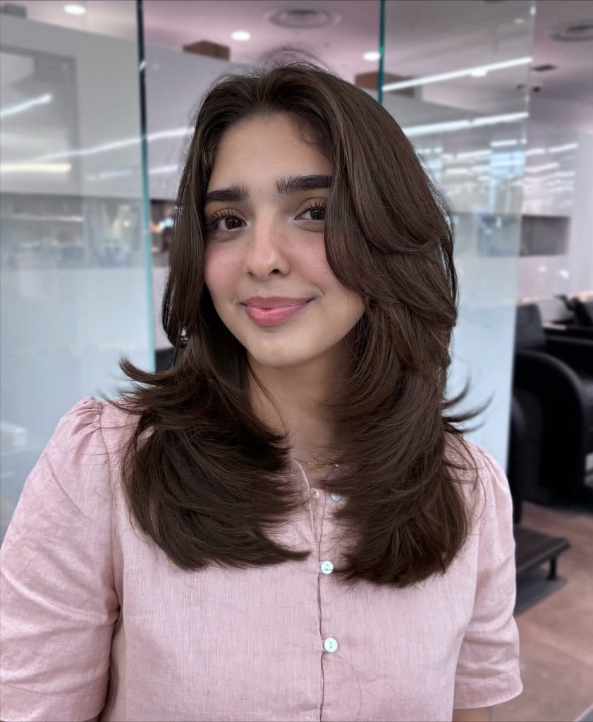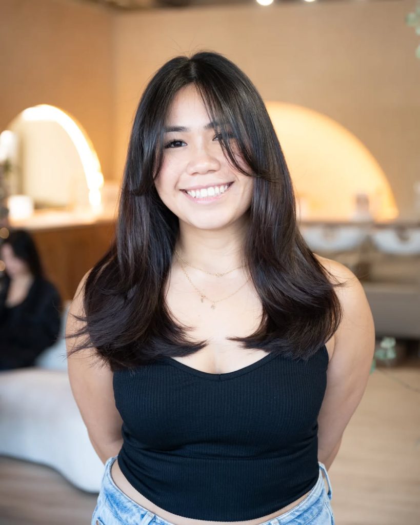 This cut leans into butterfly layers and breezy curtain bangs—face-framing at the cheekbones, then tapering to a feathery flip at the shoulders. The result is youthful, flattering, and camera-ready.