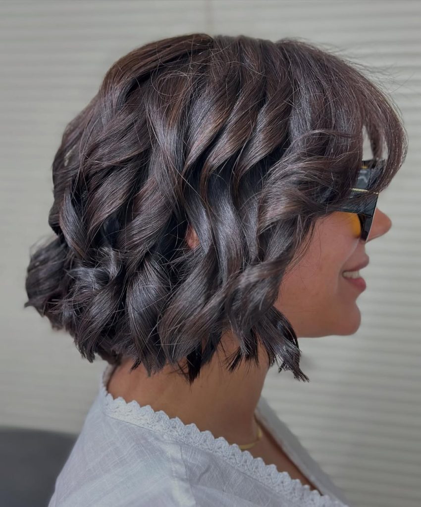 There’s a reason Curly lobs never quit: sculpted spirals + off-center lift = instant cheekbone. Here the curls are ribboned from mid-shaft to end, with the crown lightly backcombed to create a buoyant swoop. The ends are cut blunt, while interior micro-layers remove bulk, so you get volume without triangle poof.
