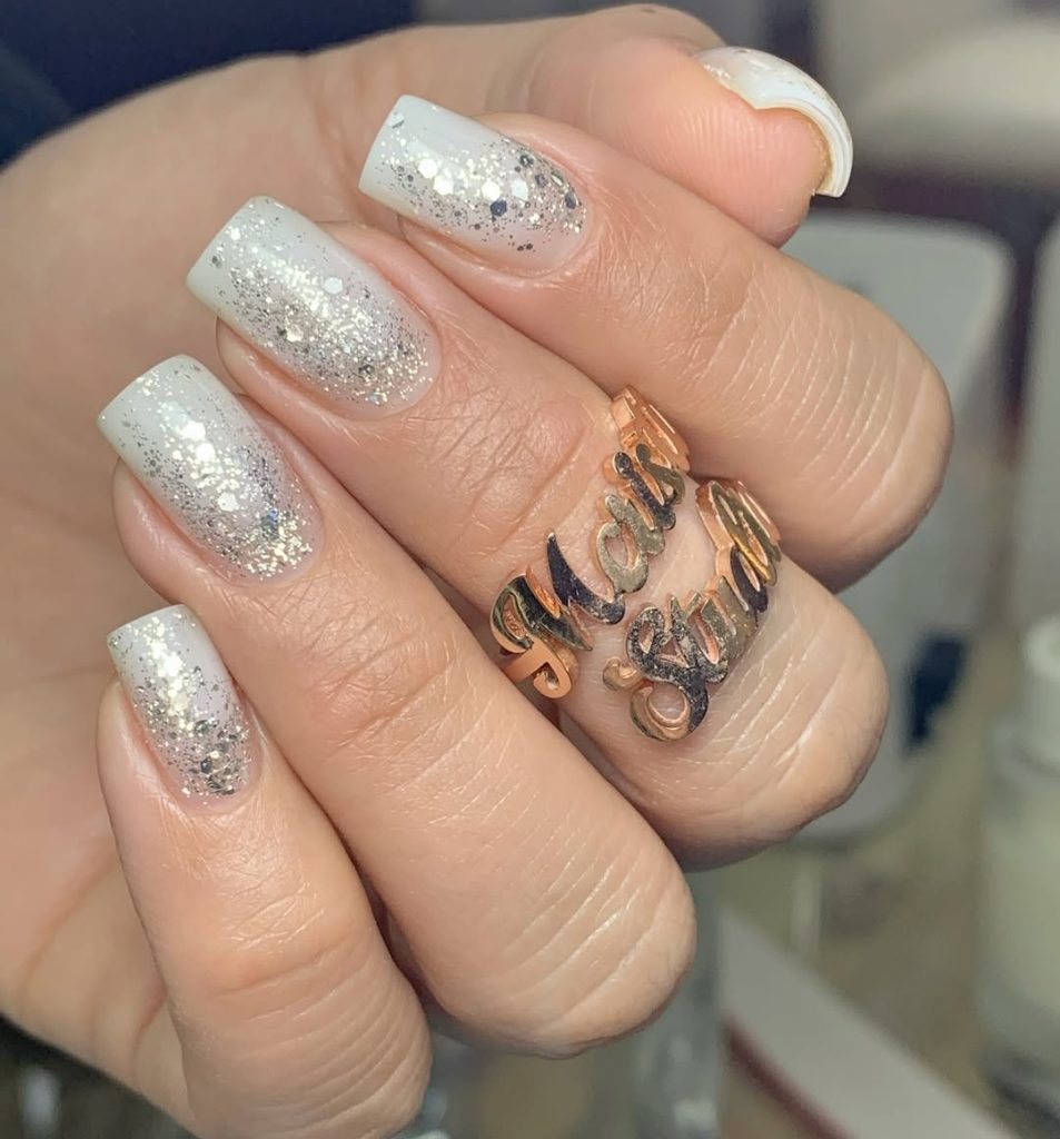 This manicure leans into cool tones with crisp opaque white on square nails, topped by a gradient of silver glitter that starts near the cuticle and intensifies toward the tips. The result is icy and luminous, like freshly fallen snow catching streetlights. It’s refined but absolutely not shy.