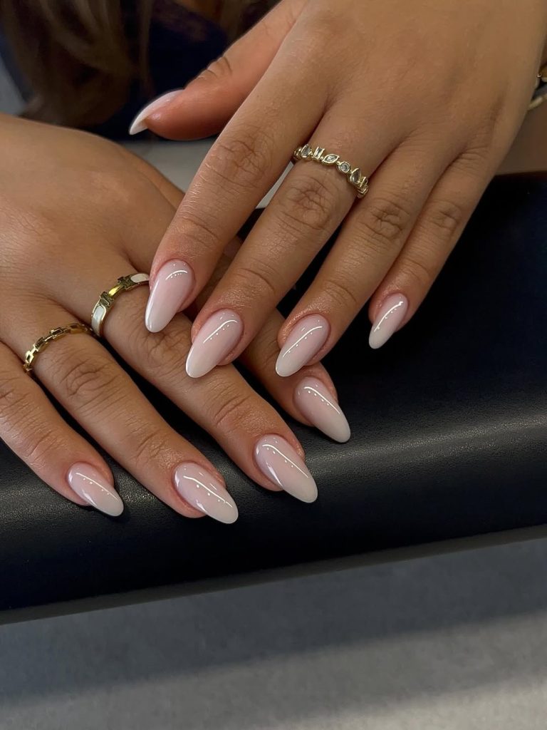 Soft nude fades seamlessly into off-white on elongated almond nails, creating that timeless French-ombre effect that refuses to go out of style. There’s no harsh line—just a blurred gradient that makes the nail beds look longer and the fingers more delicate. It’s polished enough for a corner office, yet relaxed enough for Sunday errands.