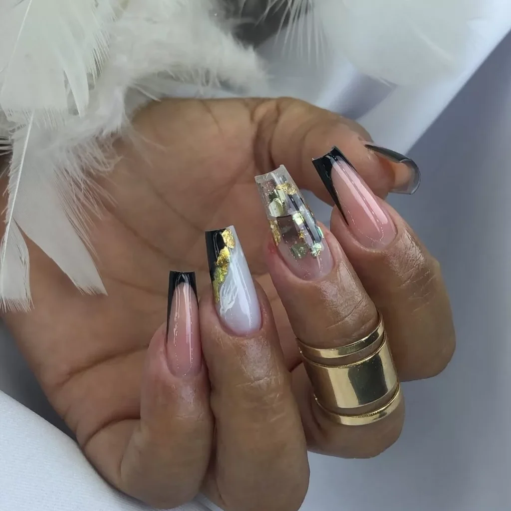 This look is for the woman who loves structure and drama. Long, straight-edged nails sit between square and ballerina, with a sharp black French tip on some nails, glossy white and gold on others, and a transparent accent nail filled with reflective fragments. The combination of black, white, and gold creates a high-contrast palette that feels both luxurious and slightly edgy.