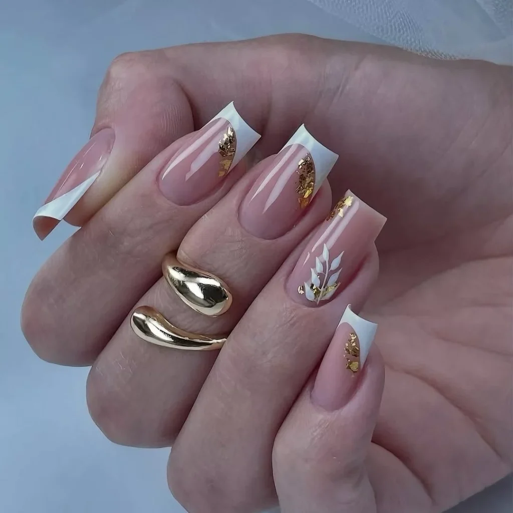 Here, neutral nails take a botanical, almost romantic turn. A sheer nude base supports angled white French tips that sweep across the corners of square nails, leaving negative space at the sides. Gold foil accents dance along the tips, and one feature nail showcases a tiny white leafy motif, like a minimalist laurel branch.