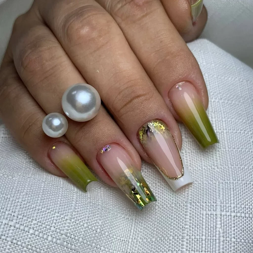 Finally, a bolder take on neutrals that still feels wearable. Long square nails have a soft gradient of moss and lime green at the tips, blending into a nude base. Other nails have a marble style with flowing lines, gilded accents, and a sharp white detail framed in gold. The overall look is earthy and chic, like a walk through a forest at sunset.