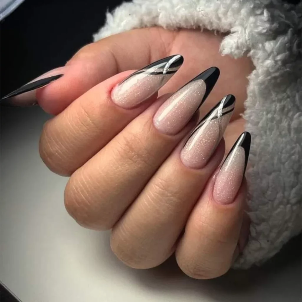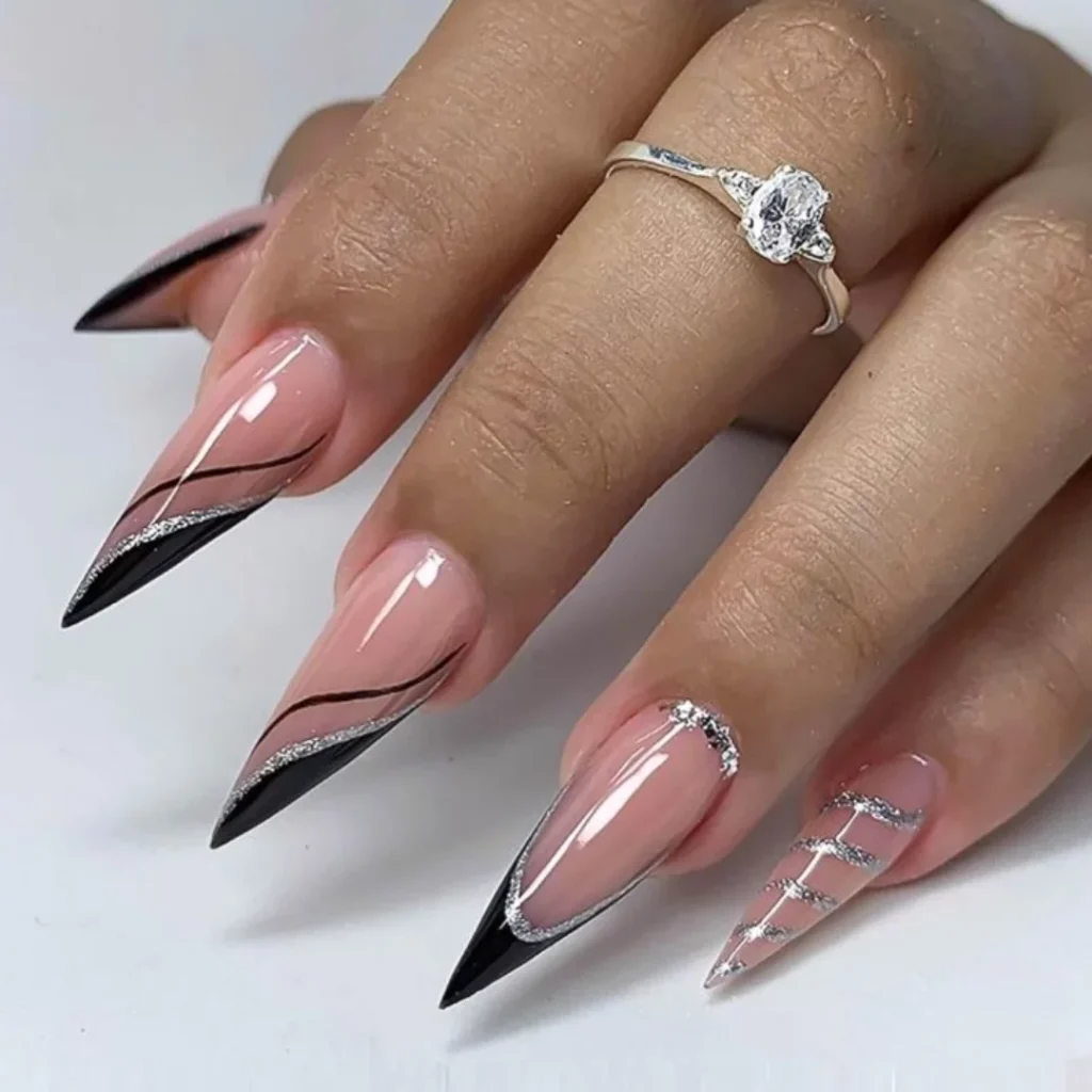 This manicure proves that sometimes you just want your nails to walk into the room before you do. Ultra-long stiletto tips are painted in a sheer nude that melts into razor-sharp black points. Silver glitter and fine dark lines sweep diagonally across the surface, creating a fluid, architectural design that looks like it belongs on a runway mood board. It’s fierce without feeling costume-y, which is exactly the balance so many women are chasing for 2026.