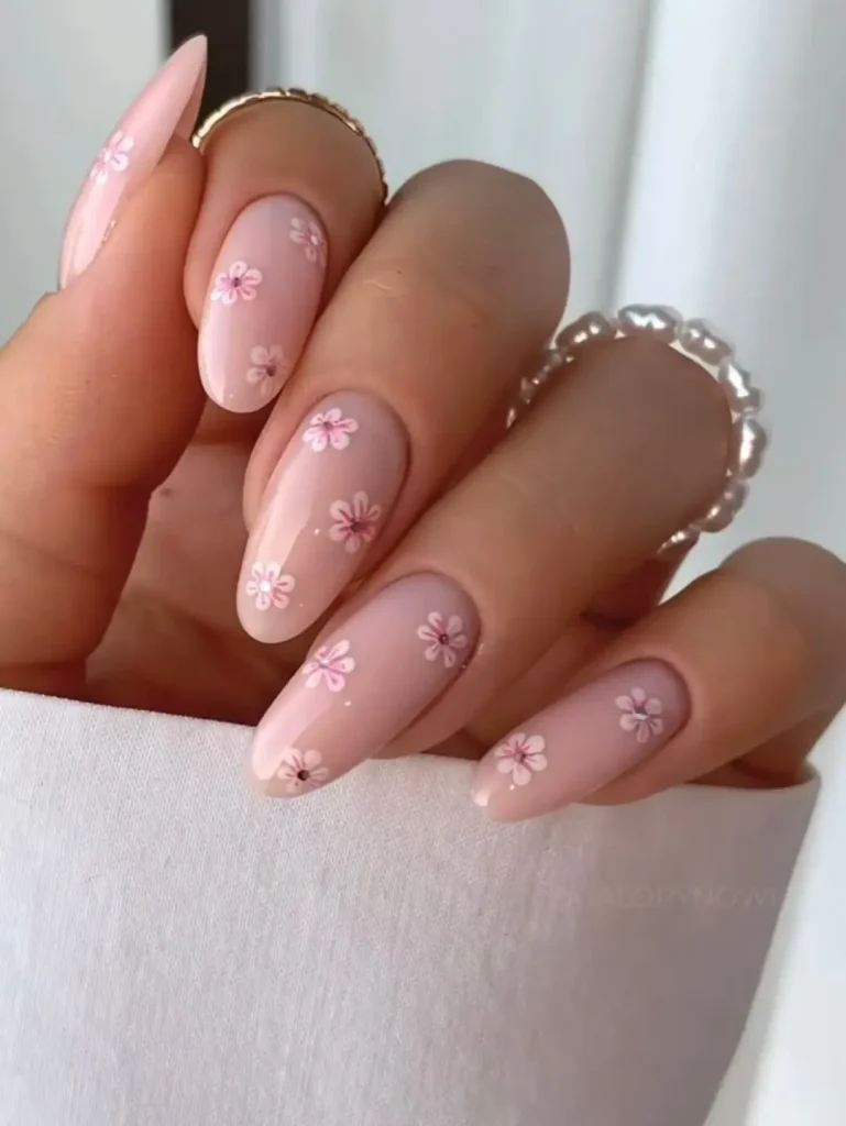 Here, the mood softens into something light and romantic. A creamy nude-pink base covers medium-length almond nails, each one sprinkled with tiny, hand-painted blossoms in petal shades of blush and white. The centers are slightly darker, giving just enough contrast to feel lively without overwhelming the eye. It’s the kind of manicure that feels at home with floaty dresses, white denim, and all the delicate jewelry you’ve been collecting.