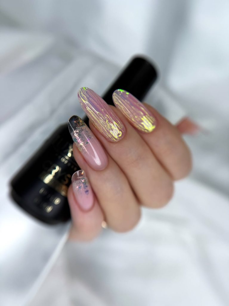 If you’re flirting with futuristic nails, this set is your gateway. A soft blush base is the canvas for elongated tips, where two nails feature dramatic iridescent chrome—rippling gold and pink—while the others are kept sheer with subtle flecks of foil near the cuticle. The contrast between smooth glossy nails and textured chrome creates a high-impact design that still feels refined.