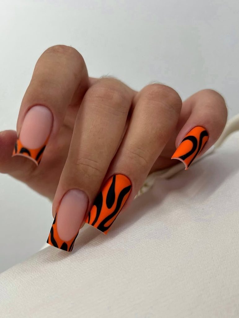 This manicure is a love letter to bold color. Long square nails are finished in a velvety matte nude across the base, then ignited with vivid orange tips licked by inky black flames. The result is graphic, rebellious, and impossible to ignore—almost like a tiny race car jacket living on your hands.