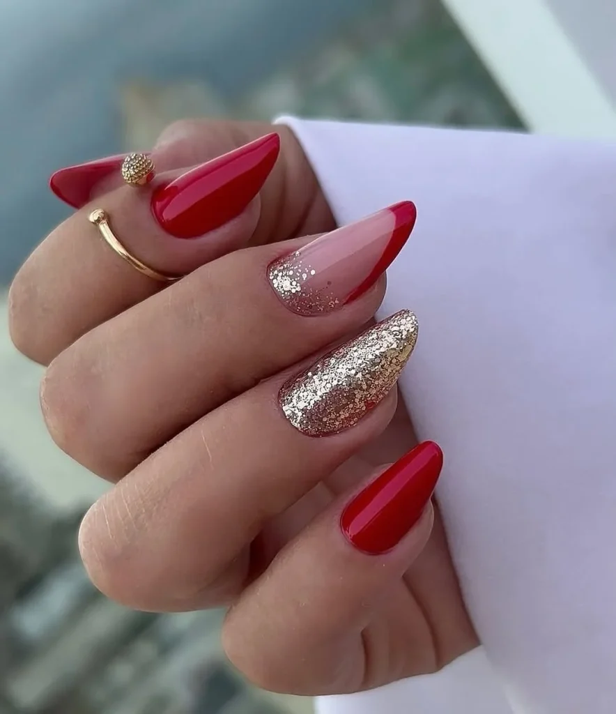 Here, classic glamour gets a modern remix. Elongated almond nails alternate between high-gloss red, a nude base with a crisp red French tip, and a full-coverage gold glitter accent. The combination feels indulgent and festive, like a holiday party captured in manicure form. The glitter is dense and reflective, catching city lights or candle glow with every hand gesture.