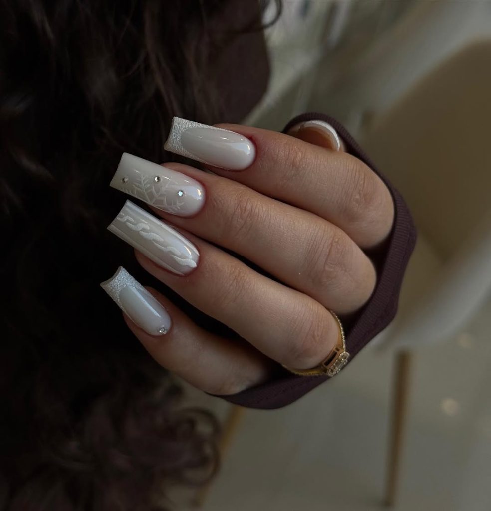 This manicure feels like your favorite cable-knit sweater translated to your fingertips. Long square nails are painted in a soft milky white, with a mix of finishes: some glossy, some textured with knitted patterns, and others detailed with delicate snowflake-style lines and tiny metallic studs. The overall effect is plush, wintry, and quietly luxurious.