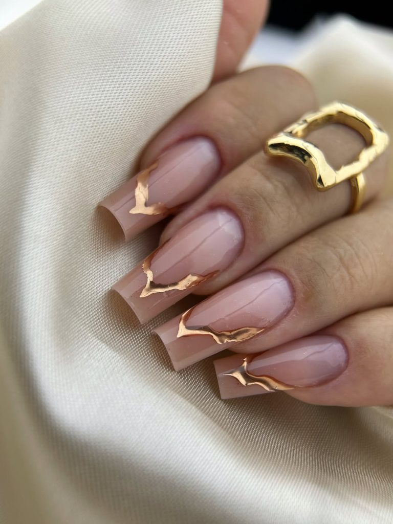 This set looks like jewelry poured directly onto the hands. Long square nails are painted in a soft, neutral nude, then traced with molten metallic lines that mimic kintsugi cracks in porcelain. The gold edges hug the tips and sides in an irregular pattern, so every nail feels like its own tiny artwork. It’s minimalist from afar but incredibly detailed up close—exactly the kind of subtle luxury trend forecasters are predicting for 2026.