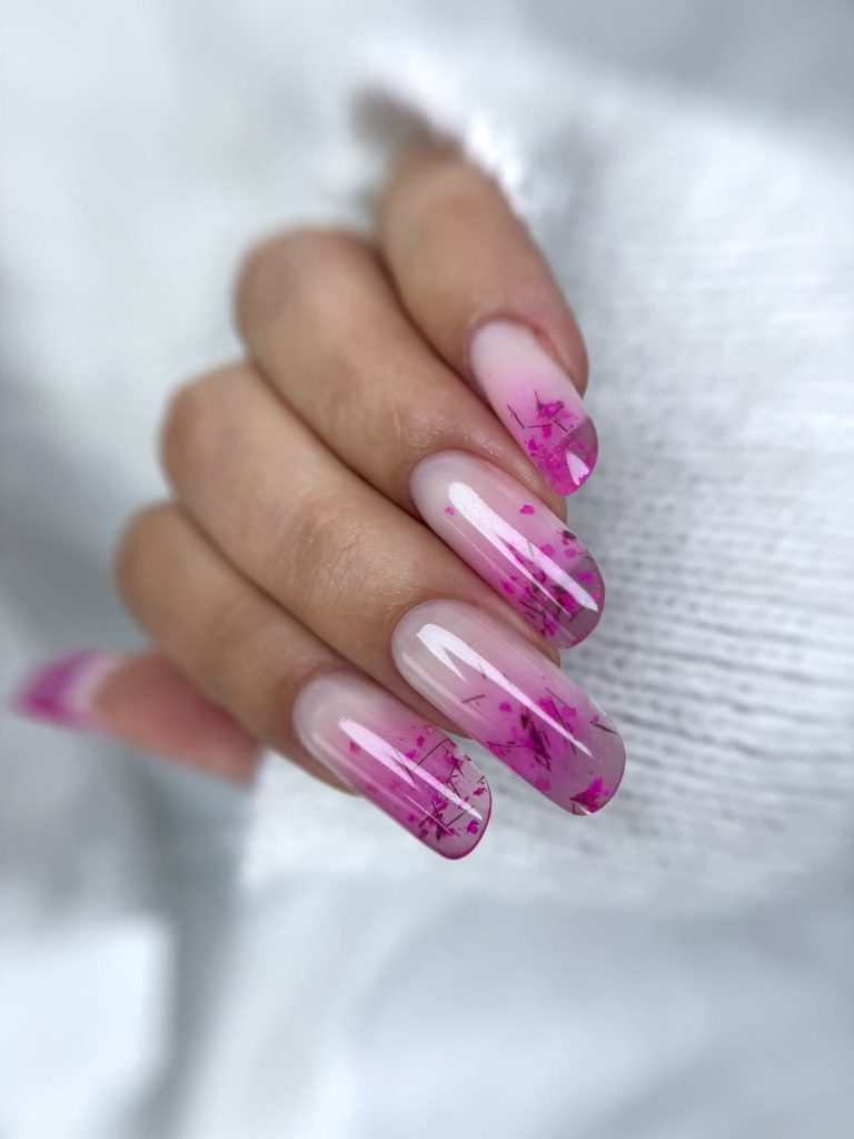This manicure feels like a fresh bouquet translated into polish. A milky nude base fades into soft pink at the tips, sprinkled with shards of bright magenta foil that look like dried petals caught in motion. The length is graceful and slightly tapered, skimming the line between coffin and ballerina, which makes the fingers look extra long and slim without sacrificing practicality.
