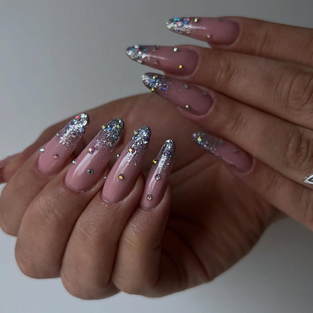 Here, maximalism gets a chic makeover. Long almond nails are washed in a rosy nude and drenched in silver glitter that concentrates at the tips, then scattered with tiny iridescent crystals along the length of each nail. The sparkle picks up every color in the room—champagne, icy blue, soft violet—so the set shifts beautifully from daylight to candlelight.