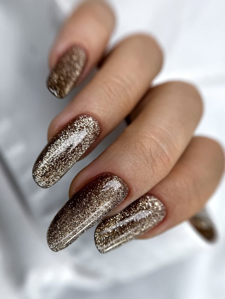 If your heart belongs to cozy knits and spice lattes, these nails are your season in a bottle. Long, softly rounded tips are coated in a deep bronze base, then saturated with fine gold and copper glitter that gets denser toward the ends. The result is a molten-metal effect that feels both luxurious and a little mysterious—perfect for shorter days and city lights.