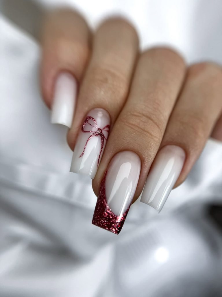 This set channels the joy of unwrapping presents. Long square nails feature a milky white gradient, while two accent nails are finished with ruby glitter tips and a delicate bow drawn in matching sparkle, like tiny ribbons tied around a package. It’s charming without being childish, the perfect middle ground for women who want something festive but still fashion-forward.